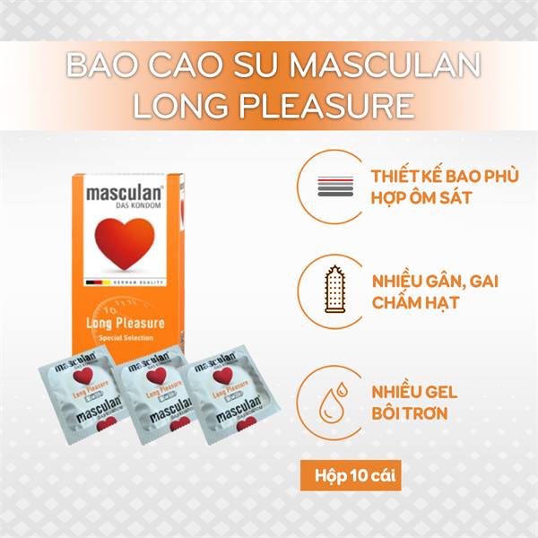 Bao cao su Masculan hộp 10 cái là dòng sản phẩm cao cấp có xuất xứ từ Đức, được sản xuất bởi công ty M.P.I Pharmaceutica GmbH. Sản phẩm này nổi tiếng với chất lượng cao, vật liệu cao su tự nhiên, và mang lại cảm giác chân thật